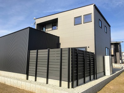 コンクリートテラスと板塀フェンス シンプルモダン風