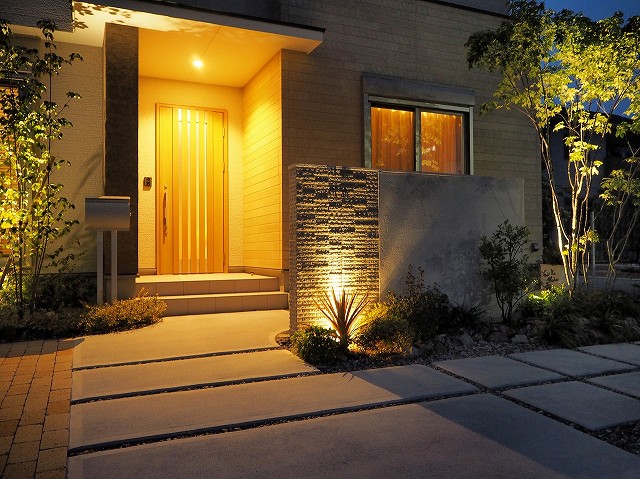 門柱や表札を照らす照明、玄関までのアプローチを照らす照明、植栽を照らす照明。