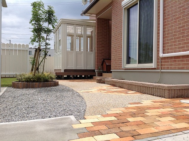 白いガーデンルームに似合うレンガならではの優しい色調です。