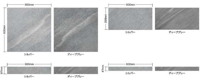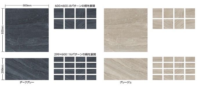 躍動感のあるハイセンスな天然石調タイルで、600×600、299×600の2種のご用意があります。表情豊かな柄のパターンを展開しており、並べても飽きのこない空間に仕上がります。