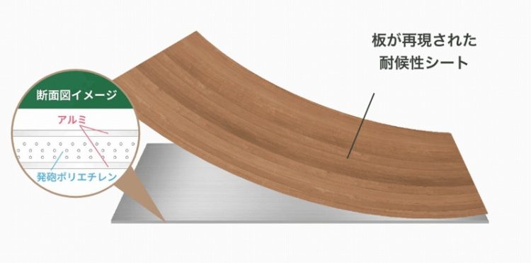 ボードにアルミと樹脂の複合板に木や石、金属などのテクスチャーを再現した、耐候性シートをラッピングされた商品で、ブロックを積んでつくる壁と比べて施工費を抑えることが出来ます。