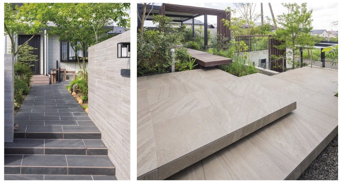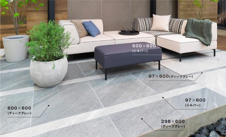こちらは天然石調の深みのある風合いが、こだわりの表情を空間に与えます。玄関アプローチ、テラス床、壁面など、スタイルを選ばずにお使いいただけます。サイズ展開は全部で4タイプ。異なるサイズとカラーを組み合わせることで、個性的でこだわりの空間演出が可能です。