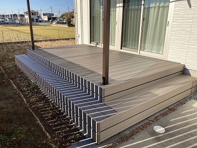 メインのデッキの一段下にローデッキを設置しているので昇り降りがしやすく、室内とお庭の距離が心理的に縮まります。
