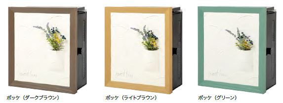 ポストを絵画になぞらえて木の質感の額縁に、漆喰の塗り壁に可憐な造花を立体的に取り付けたクーリエ ポッケ。