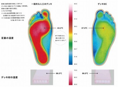 その結果、一般的な人工木デッキよりも素足で乗った足裏温度が4°低く抑えられました。