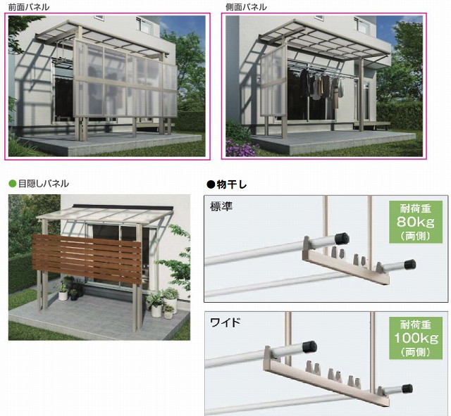 レセパのオプションには、前面パネルや、目隠しパネル、物干し、風が強い地域でおすすめの着脱式サポートなどがあります。