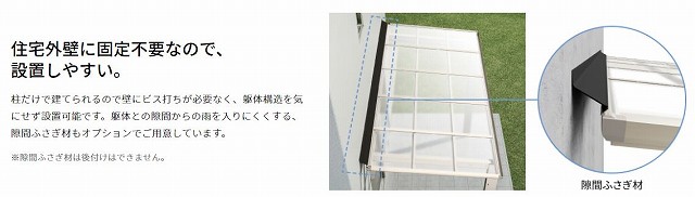 隙間ふさぎ材をオプションで付ければテラスと建物の隙間からの雨を入りにくくしてくれます。