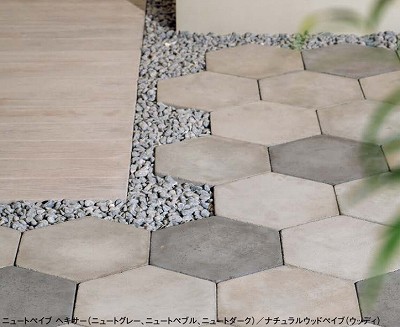 TOYOから発売されました舗装材ニュートペイブへキサーはコンクリート製品が持つ素朴な味わいに、六角形のデザインがどことなくレトロな雰囲気を感じさせます。