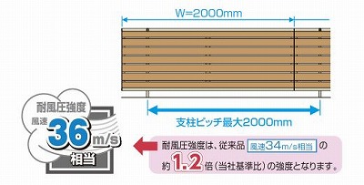 支柱ピッチが2000mmで耐風圧強度が36m/s相当。
