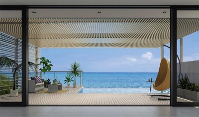 業界最大級の間口4.5間(8000mm)の実現と、高級感のある格子デザインで、日射しと風を程よく取り入れながら、外からの視線を遮り、上質でリゾートのような空間をつくり上げます。