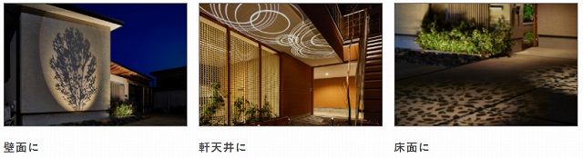 グラフィックスポットライトは、壁面に大きく映して家のシンボルに、軒天井に映し出して癒しの空間に、床面に映し出してアプローチなどに遊び心を加える・・・など様々な使い方があります。