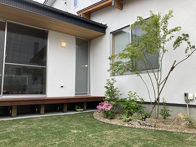 主庭部分には高麗芝を貼り、イロハモミジ、アオダモ、シラカシ、ハクサンボクの立木、紫陽花等の低木を窓からの景色、ウッドデッキに座った時の景色を考えながら配置しました。日が暮れると植栽がライトアップされます。