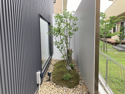 坪庭となる部分は化粧ブロックで囲いGLラインを350mm程上げております。背景にはタカショーのエバーアートボードを配置しました。カラーは塗り壁調の琉川ホワイトです。イロハモミジと六方石をバランスを見ながら配置し床面はハイゴケを少し起伏を持たして貼り付けました。