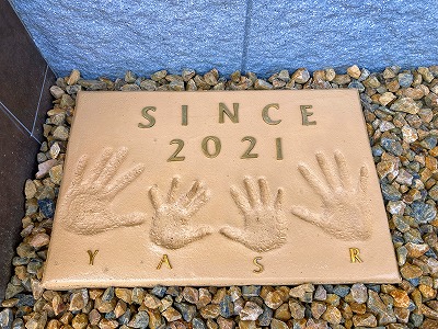 ご家族4人で新築記念の手形をご希望でしたので、職人さんと日程調整をしてもらって付けていただきました。この写真を見てるだけで何だかとっても微笑ましい気持ちになりますね!