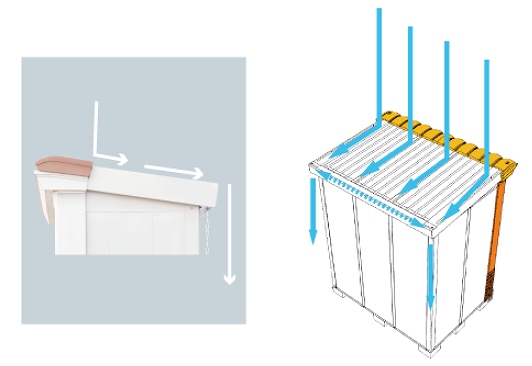 背面上部には雨どいが標準装備され、屋根に落ちた雨水はその雨どいからチェーンを伝って地面に落ちるようになっています。