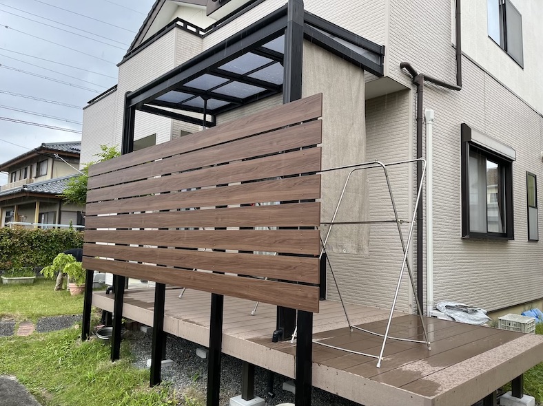 老朽化した木製デッキを樹脂デッキに交換し、その際設置してあった既存テラスを再設置。デッキ正面にはアルミ製の板塀を設置しプライバシーを確保しました。