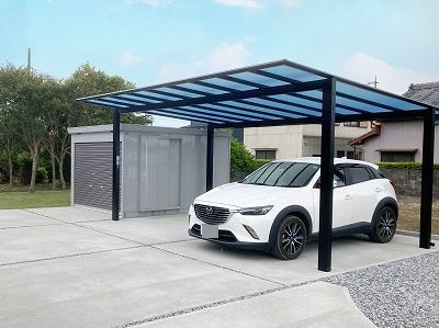 2台用のカーポートとバイク用のガレージを設置しました。カーポートの屋根材には熱さを軽減する熱線遮断ポリカーボネート板を使用しています。また雨水を奥側に排水するために屋根の勾配は奥側が低くなるように設置しました。