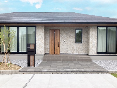 玄関前には幅3mの広々としたアプローチを設けました。玄関タイルの色調と合わせた舗装材を使用しました。機能門柱は玄関ドアから少し離れた位置に配置しました。玄関ドアの色やサッシの色と同系色を取り入れると一体感が生まれます。