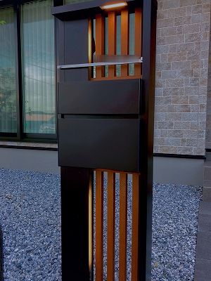 照明付きの機能門柱が夜間のアプローチをやさしく照らします。
