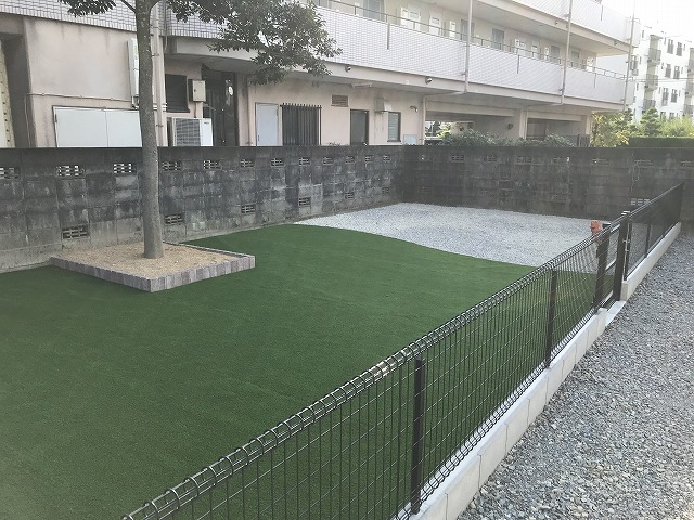 ドッグランは人工芝、砂利を敷き、ワンちゃんに楽しんでもらえるよう工夫しました♪
