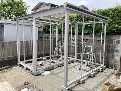 基礎ブロックを設置して物置の枠組みを行いこの後外壁面を施工していきます。