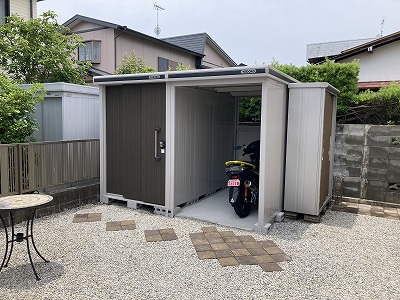 お子様が大きくなって使わなくなったバスケットコート空間をバイク乗りのご主人のガレージ空間に変わりました。剥がした石材は処分せずに一部ご主人様がDIYで敷きなおしました。元々設置されていた物置の移動も行いました。