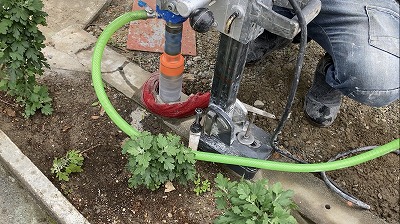 既存のコンクリート壁にある程度の径穴を開ける場合、コンクリートドリル等では開けることが難しいためコア抜き機を使用し、回転するコアドリル部分に水をかけながら切削していきます。そして必要な深さまで切削が終わった後、切削した部分に少しハンマー等で衝撃を与えると円柱状にコンクリート壁部分に穴をあけることができます。
