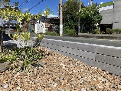 境界ブロックには東洋工業の『モデリート』を使用、400mm×200mmが一般的なブロックの大きさですが、『モデリート』は800mm×100mmという大きさでデザインにも組み込みやすいです。