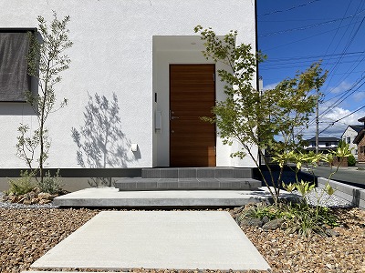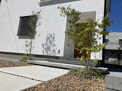 玄関前には道路からの目隠しを兼ねて葉が多めのイロハモミジ、玄関横には細身のオリーブを配置しました。どちらもお施主様と一緒に圃場を回り、実際に目で見て樹木を選びました。