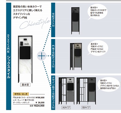 オプションでシンプルな門柱にアクセント格子や宅配ボックスを設置することが出来、グレードアップすることも可能です。