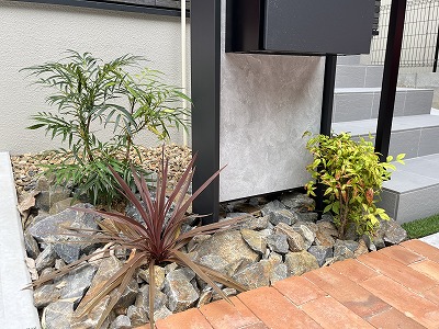 また、門柱の下のアクセントとして割栗石を敷き、コルジリネ・マホニアコンフーサ・オタフクナンテンを配植しナチュラル感をプラスしました。
