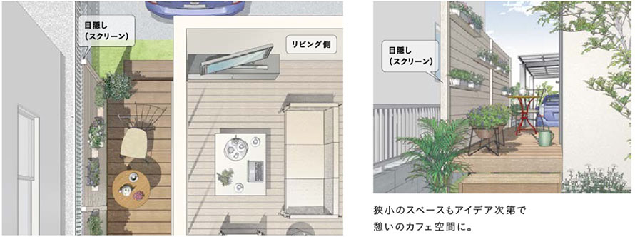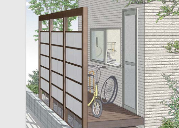 ドアと同じ高さにできるスクリーンを設置し、隣地境界スペースにデッキを敷けば、勝手口からの通路になり、ちょっとした物置にもなります。