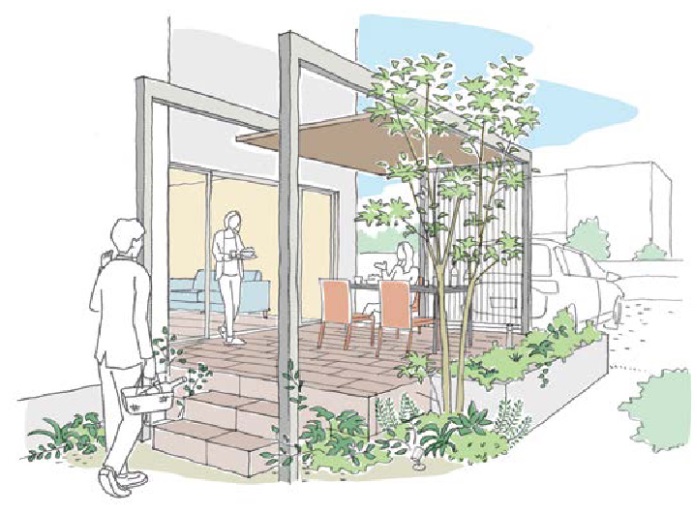 素材や形状が選べるタイル素材のデッキに段差をつけて、人が行き来しコミュニケーションがとりやすい庭に。