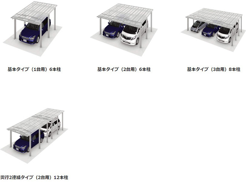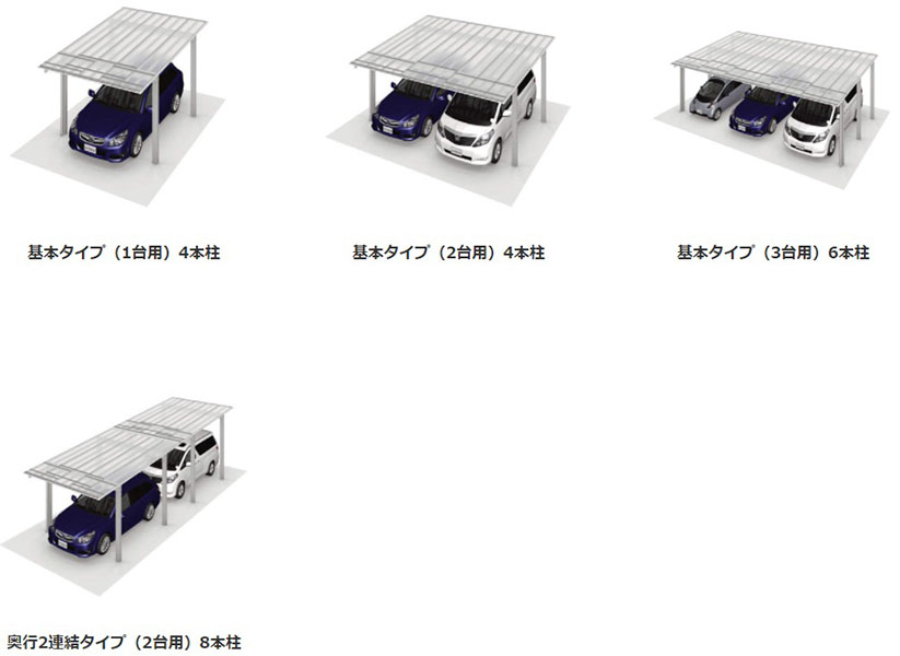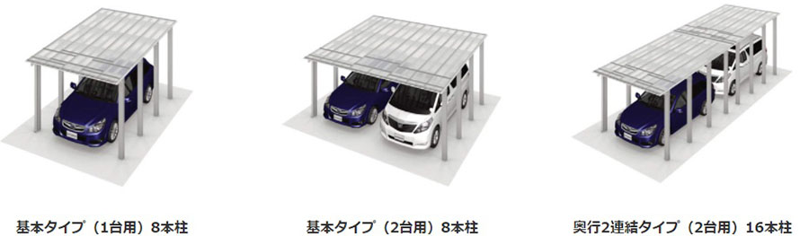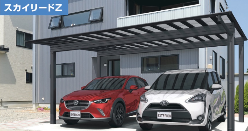 中桟のない構造の屋根と透過性のある屋根パネルで採光が得られる明るいカースペースを実現します。しかも、前下がりの屋根勾配なので、リビング前などにカーポートを設置する場合でも、室内が暗くなりすぎません。また、正面のフラットラインが住宅外観の水平ラインと調和します。
