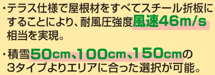 気象庁の年最深積雪資料によると、日本列島の約50%が最深積雪20㎝以上の積雪地であり、さらにその大部分が最深積雪50㎝以上の豪雪地に分類されています。テラスを設置される場合、お住いの地域の積雪量を十分考慮してお選びください。