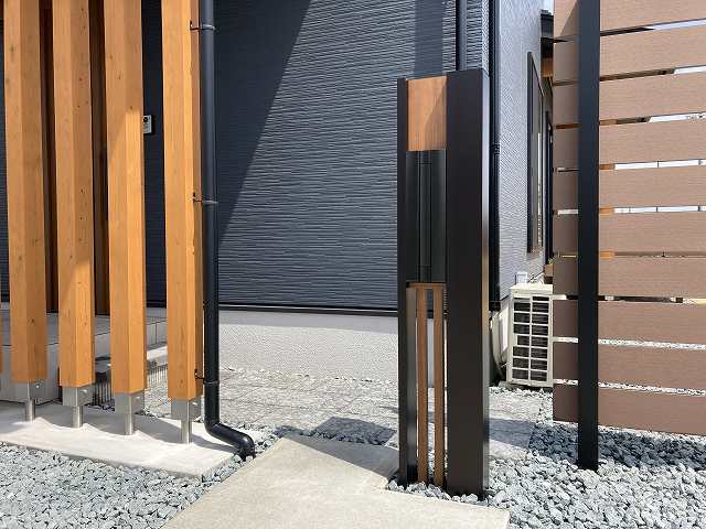 門柱カラーも建物に合わせてブラックと明るい木調カラーを組み合わせました。
