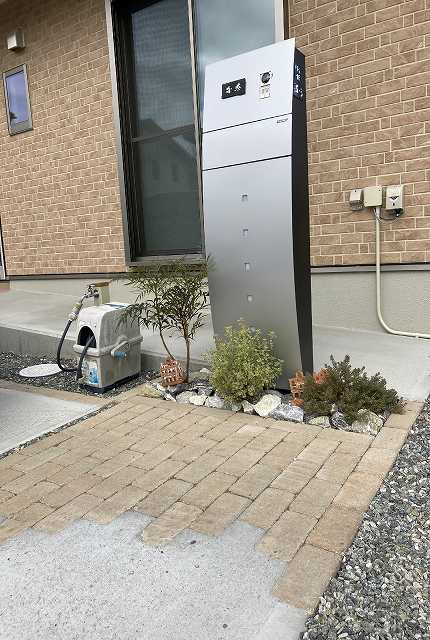 こちらは、大容量の宅配ボックスと、これまた大容量のポスト、インターホンと表札が一体となった機能門柱「パナソニック/アーキフレーム Fタイプ」を使用しています。