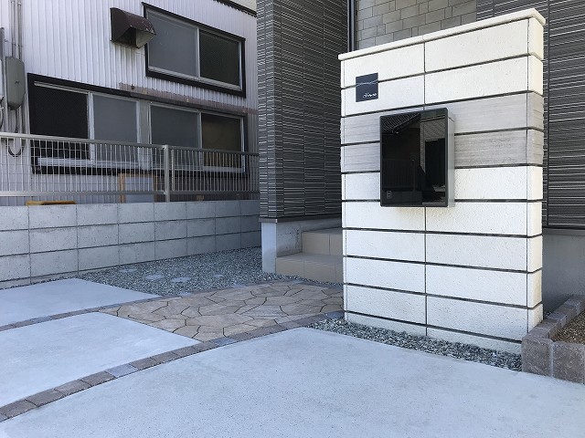 こちらは、普通ブロックにデザインタイルを貼って仕上げた門柱です。