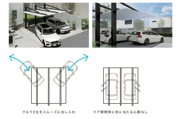 また、左右に柱がないことで、ドアが柱にあたる心配もなくなり、通常のカーポートと比べて乗り降りがしやすくなっています。