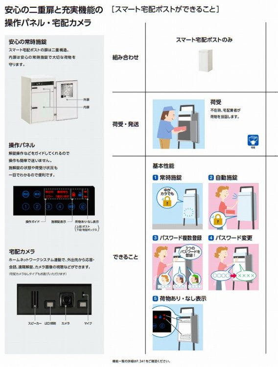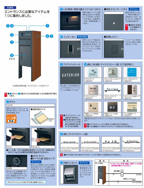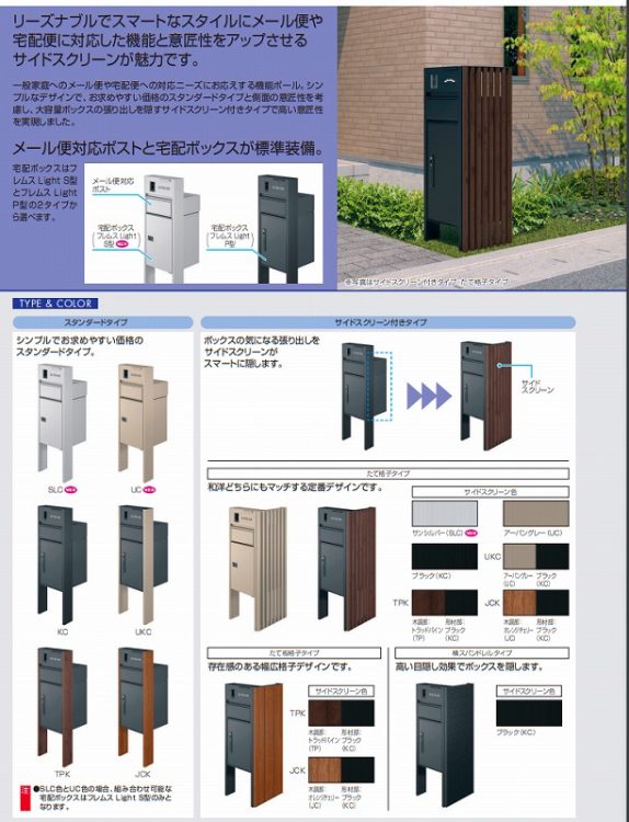 一般家庭へのメール便や宅配便に対応する機能ポール。シンプルなデザインで、お求めやすい価格のスタンダードタイプと意匠性をアップさせるサイドスクリーン付きタイプをラインアップがあります。