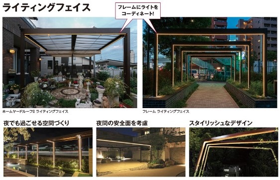 ホームヤードルーフのフレームにライトをコーディネートする事で、昼間とはまた一味違った幻想的な夜の風景をお楽しみ頂けます。
