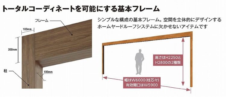 ホームヤードルーフは、基本フレーム呼ばれる骨組みと、ルーフ屋根と呼ばれる屋根材を組み合わせることによって、自由に設計する事ができます。