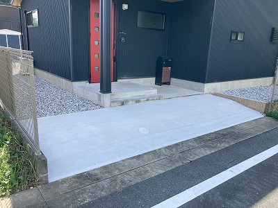 アプローチはシンプルなコンクリート舗装で道路からの高低差は施工前と同じようにスロープ状に収めました。