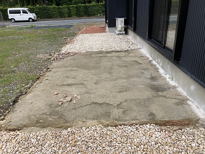 掃き出し窓の手前も固まる土と砂利を施工済みでしたが経年劣化のひび割れにより御施主様自ら撤去した痕になります。