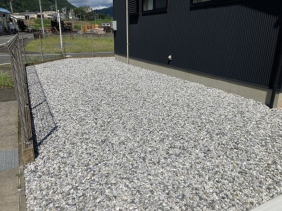 建物回りは防草シート(ザバーン240)と白砕石を敷き均しました。