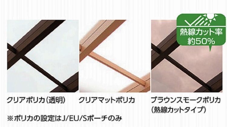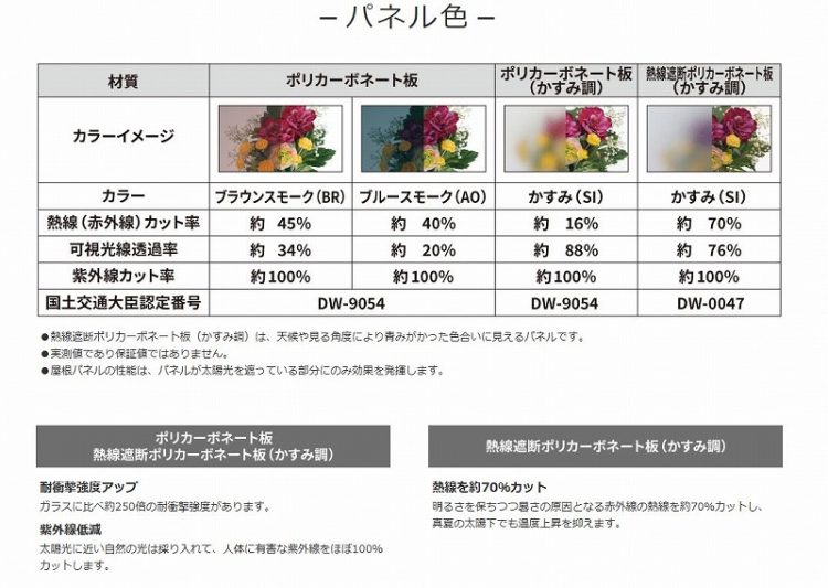 屋根パネルは通常のポリカ屋根に加えて、熱線を70%カットしてくれる熱線遮断ポリカからお選び頂けます。