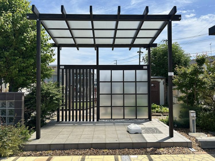 パーゴラとは、イタリア語でブドウ棚のことを意味しており、屋根部分の格子に植物を絡めて庭の景観を彩るために利用されてきました。本来のパーゴラにはパネル材などはついていないことが多いのですが、こちらは屋根パネルのついたパーゴラ風の商品となっております。