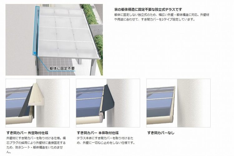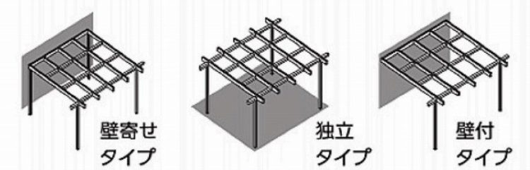 商品の施工バリエーションは展示品と同じ「独立タイプ」、建物の壁に取り付ける「壁付けタイプ」、建物の壁に寄せて施工する「壁寄せタイプ」の3タイプの施工が可能です。