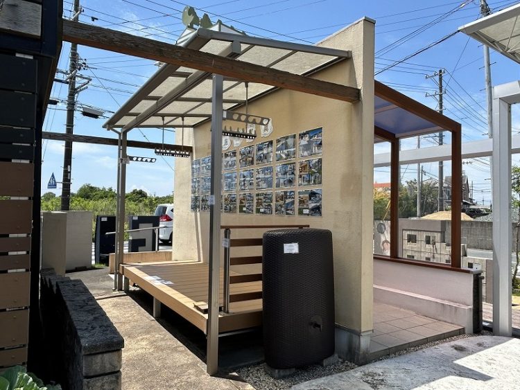 また、テラスが取り付けられた壁にはハマニグリーンパークの施工写真も展示しているので、弊社展示場へお立ち寄りの際には是非ご覧下さい。