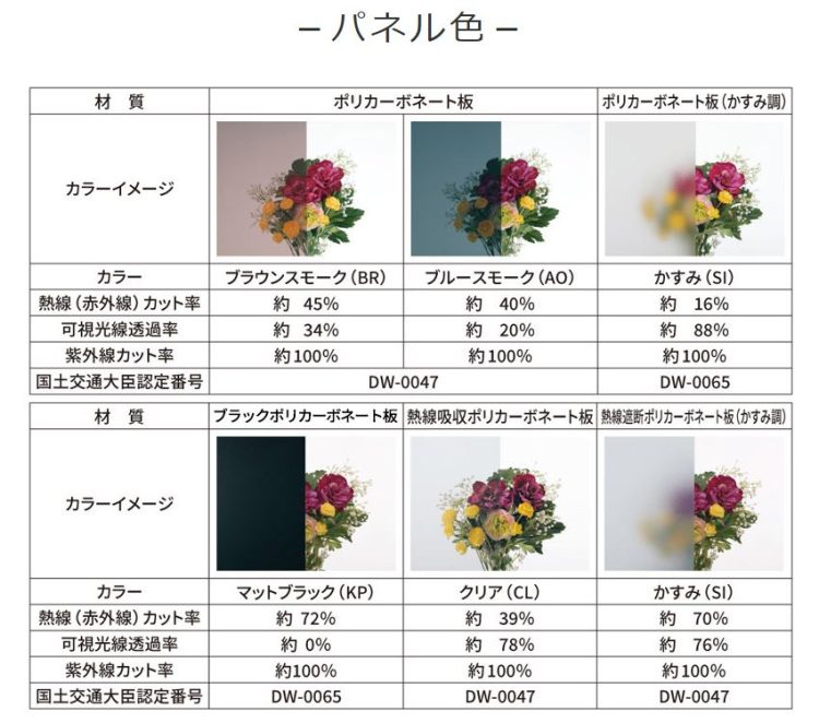 熱線カットタイプはブラウンスモークポリカを使用し、太陽からの熱線を50%カットできます。